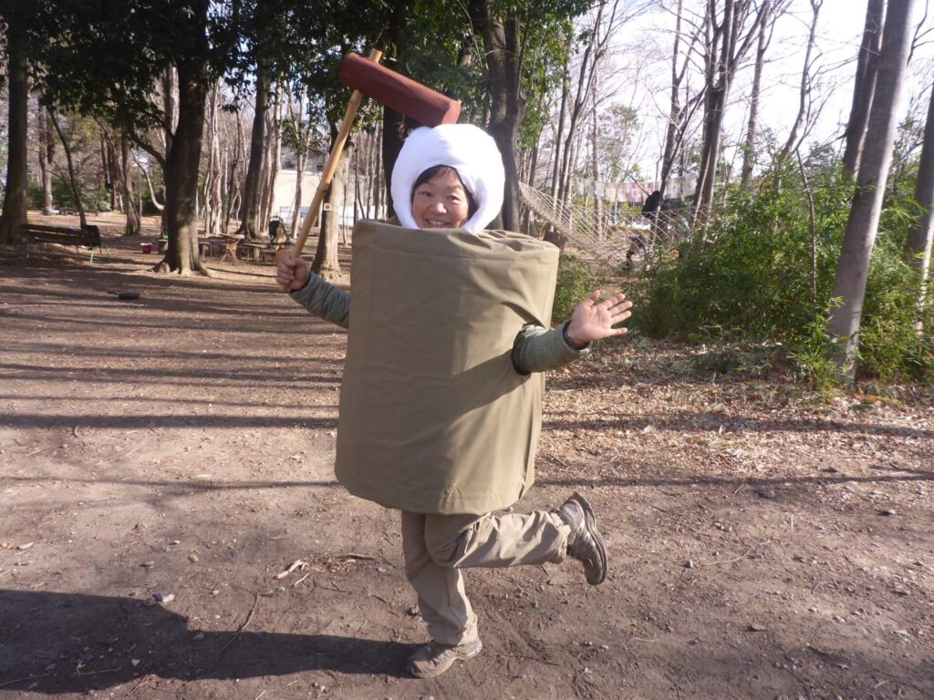結婚して日野市に来て「空ってこんなに広いんだ〜」と知った。しかし、引っ越してきたばかりで初めての子育て。土手を一人ポツンとベビーカーを押し、子を育てる親の孤独も知った。「やっぱり家族だけでの子育ては難しいんです。『嫌になっちゃうよねぇ』と言い合える仲間がいないと」と気づき子育てサークルを立ち上げる。子ども家庭支援センターの相談員などを経て現在の活動を開始。子どもも親も一緒に育つことを伝えながら、自分もこの活動であそび直している。