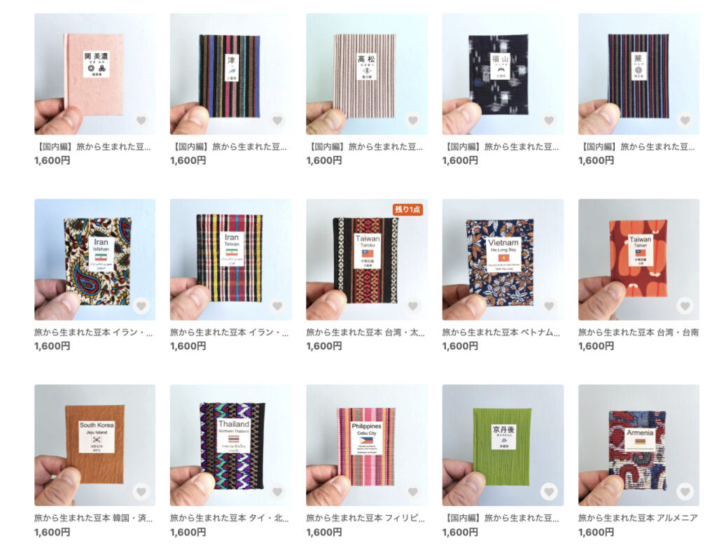 いつものようにそんなことを考えていた青木さんに、あるアイディアが浮かんだ。アイディアのきっかけは、海外旅行が好きであり、また本づくりのために、たまたま旅先で販売している布を買っていたということにあった。つまり、その国の布を表紙にして、観光名所を写真と文章で紹介する豆本を思いついたのだ。