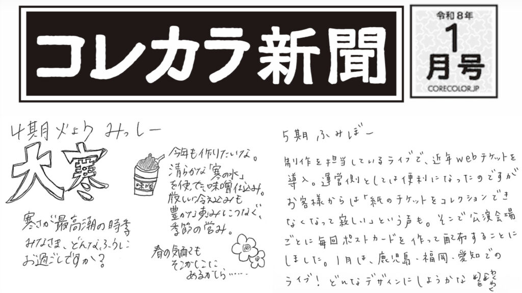 コレカラ新聞【第27回_2026年1月号】 Sat.01.10.2026 Writer コレカラ新聞 CORECOLORのメンバーが持ち回りで投稿する「コレカラ新聞」の第27号。ふんわり、ゆるーく、みんなの近況をお伝えします。 今回は みっしー、ふみぼー、Mao、あや、かおるん、みちこの6名でお届けします 記事一覧に戻る 韓国映画『大丈夫、アリス』上映会。受験戦争で追い込まれる学生は対岸の火事ではない わかりやすくしすぎない言葉たちーー2025年12月64冊の中の3冊【連載・月60冊読むkyoの「積んどかない」読書/第1回】